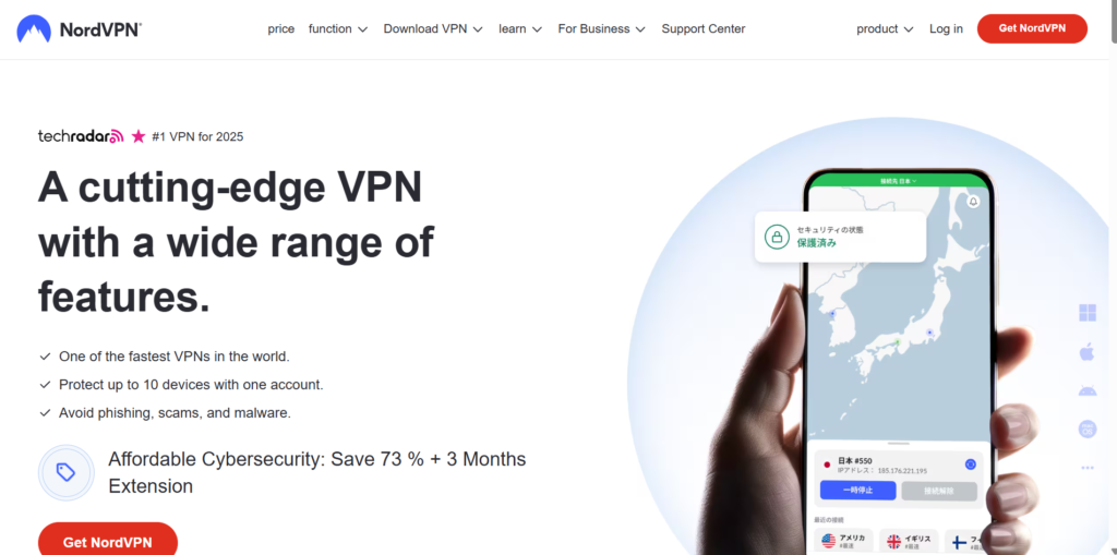 A top-rated VPN with 7,400+ servers worldwide, including 130+ in Japan. NordVPN is a popular VPN service that boasts the world’s fastest connection speeds (~200 Mbps).