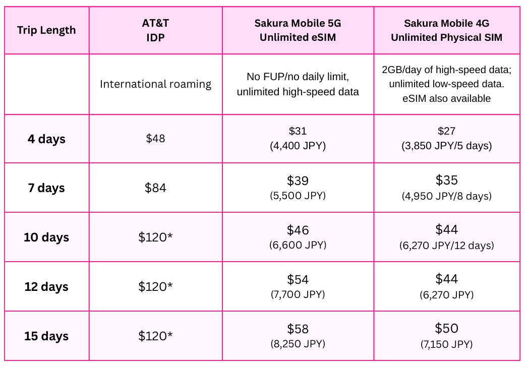 Even though AT&T’s international plans may sound convenient, they can come with hidden downsides or limits based on your domestic plan. Here’s when Sakura Mobile makes more sense: