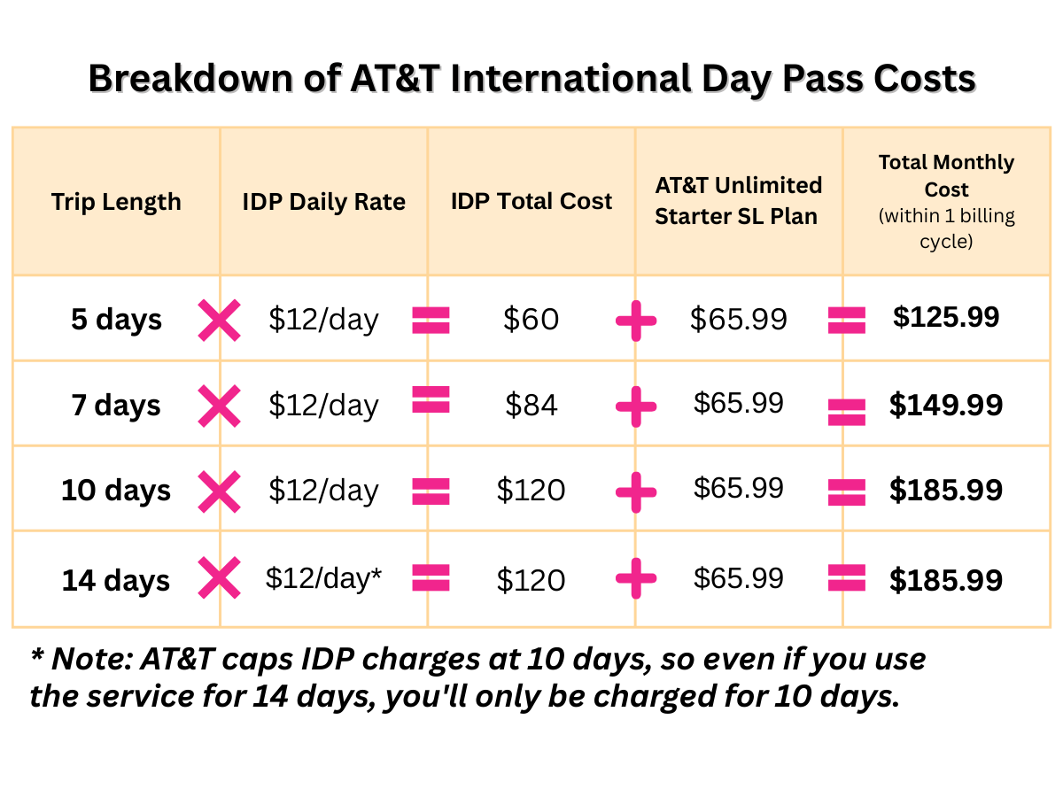 AT&T’s international plans may not be affordable and may not be the best value if you do not already have an unlimited plan. Here is a breakdown of the total costs for the IDP below (click image to enlarge):