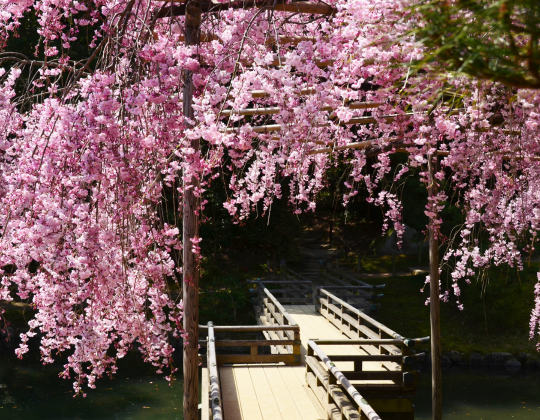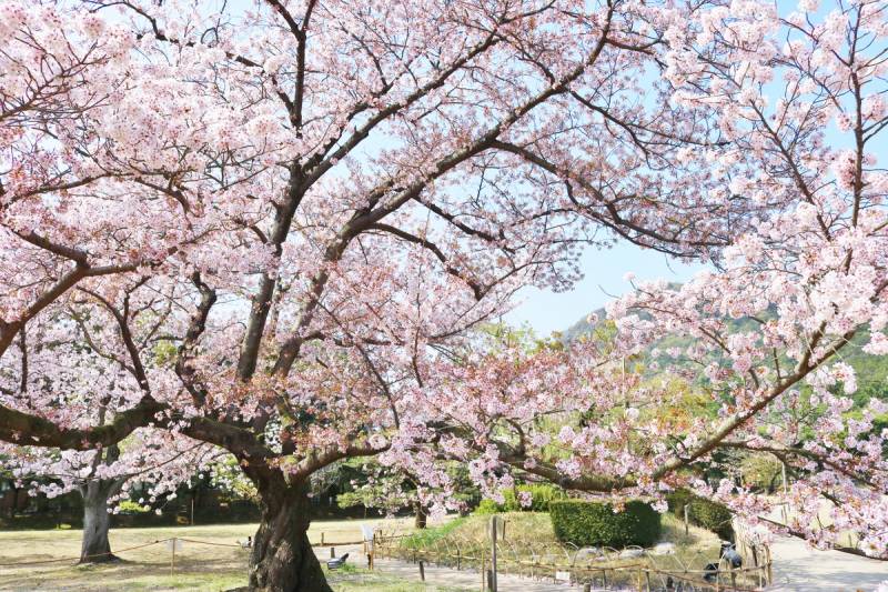 Designated as one of Japan’s three great gardens, Korakuen is a must-visit for sakura lovers. The garden’s sprawling grounds feature walking paths lined with around 280 Somei Yoshino cherry trees, offering picturesque views of the nearby Okayama Castle. You can also see a Yaebenishidare cherry blossom tree (a weeping, double-flowering tree) near the Eisho-bashi Bridge.