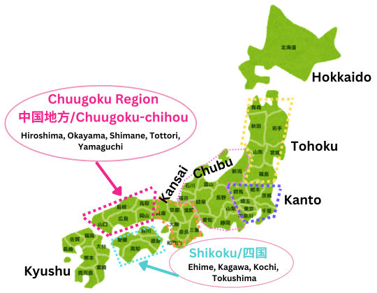 The Chugoku region is located in western Honshu, Japan’s main island, and includes Hiroshima, Okayama, Shimane, Tottori, and Yamaguchi.