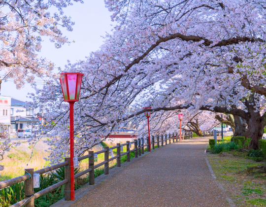 Step back in time as you walk through the samurai-era streets of Hagi Castle Town. Around 600 cherry trees line the ruins of Hagi Castle and Shizuki Park, where you can see the trees lit up at night, creating a magical atmosphere that’s perfect for photos. In addition to Somei Yoshino, you can see the rare Midori Yoshino cherry (specified as a Natural Treasure in Japan) in Shizuki Park. During sakura season, you can ride the Hagi Sightseeing Boat and view cherry blossoms along the river.