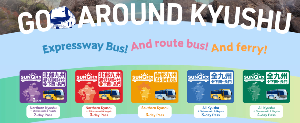 1) SUNQ Pass: Unlimited rides on highway and local buses in Kyushu. Can be purchased online or at major bus terminals.
