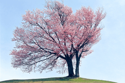 These trees stand atop a hill, surrounded by a field of shibazakura, or moss phlox. The two trees appear to be snuggling close together, offering visitors a warm and inviting sight.