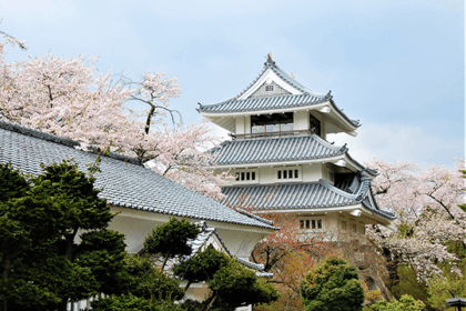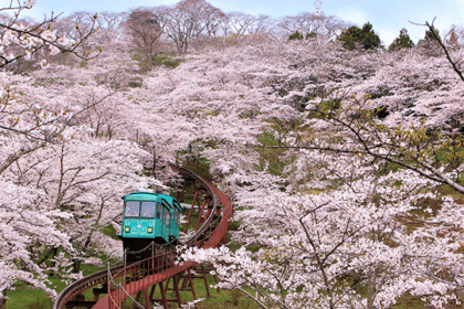 Funaoka Castle Ruins Park is where the former Funaoka castle stood until the Meiji Restoration. During spring, visitors can experience a 305-meter retro train ride on a cherry blossom mountain.