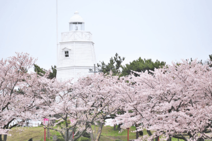 The park features a chalk-white hexagonal lighthouse, one of Japan’s oldest wooden lighthouses, which has become a popular symbol of the park.