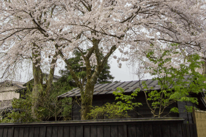 As the shidarezakura trees arch over the fences and gates, they frame both sides of the street.