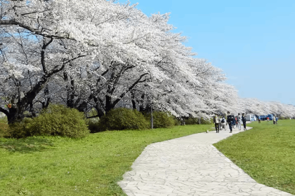 During the spring, visitors can enjoy the large grass field surrounded by cherry trees with varieties such as somei yoshino, shidarezakura, and wild yamazakura. The park is home to 400 cherry trees, making it a beautiful place to explore.
