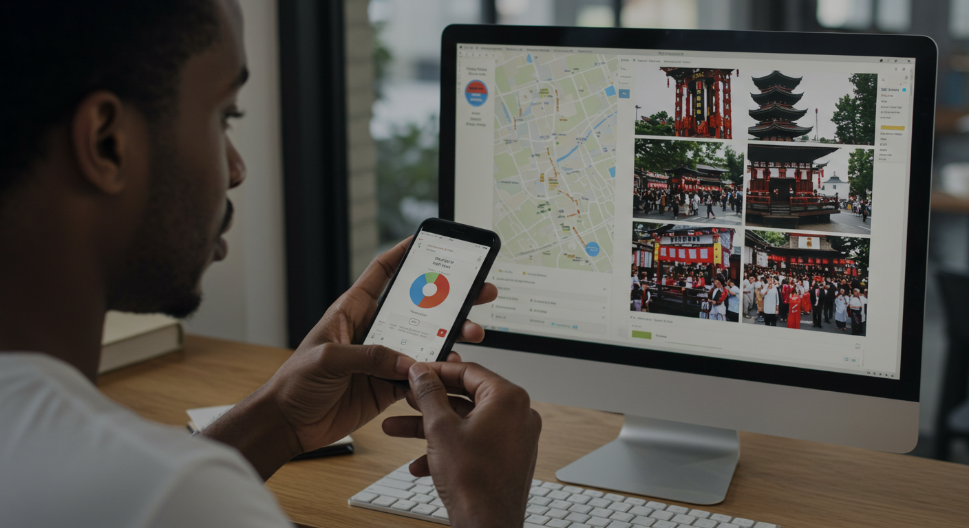 A collage or image showing Google Maps, Instagram, YouTube, and video calls around a traveler by a temple in Japan