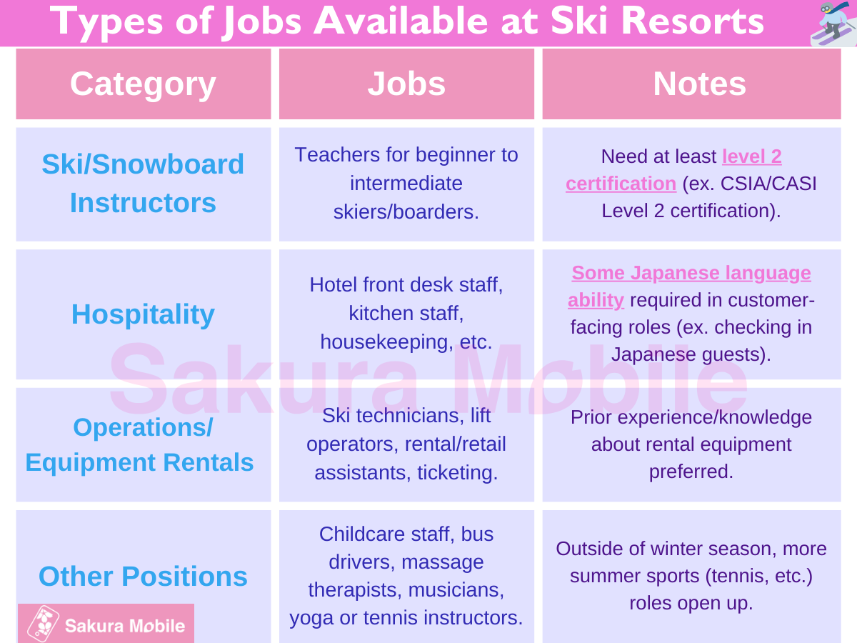 Here is a quick list of the jobs you can find at ski resorts in Japan: